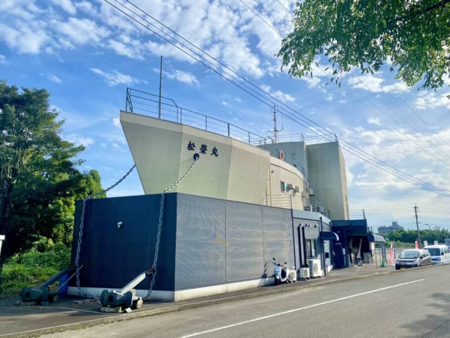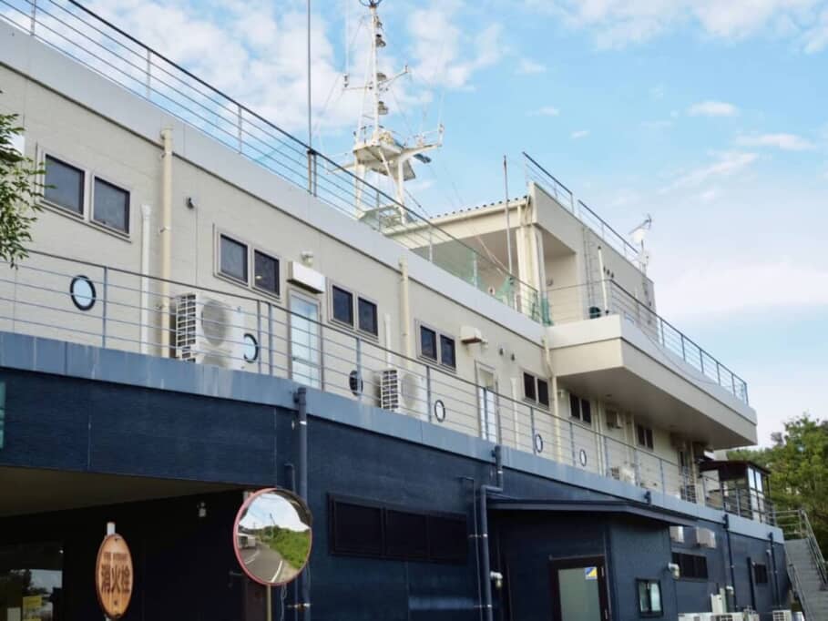 港町の通り沿いに建つ、遠洋まぐろ漁船をモチーフにした建物は、ひときわ目を引く存在。その迫力のある外観は、まるで陸の上に浮かぶ漁船のようです。