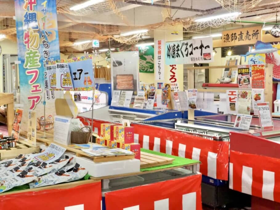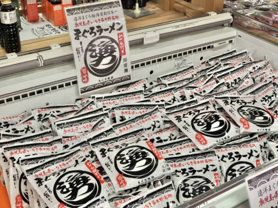 1階には、いちき串木野の特産品やまぐろ加工品が並ぶ物産館があります。新鮮なお刺身やお土産を購入できるほか、店内で手づくりする総菜や、加工品などもあります。お土産コーナーで注目したいのが、「即席まぐろラーメン」。まぐろのまちで親しまれる、ソウルフードを自宅で簡単に作れるので、お土産にもぴったり。