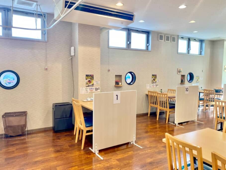 店内は漁船をイメージしたユニークな造りで、丸い窓からはかわいらしいウミガメや魚の姿がのぞきます。まるで海の中にいるような雰囲気で、お子さま連れのお客様にも利用しやすいお座敷席もあります。